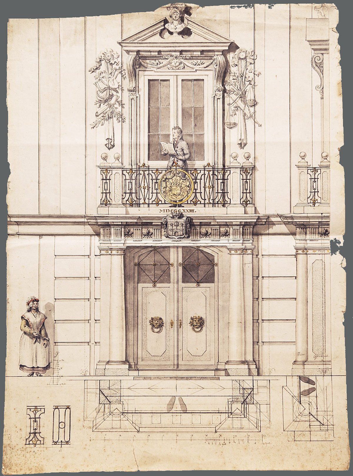 Entwurf der neuen Eingangsfront des Rathauses 1824 1824 zeichnete der Eichstätter Bildhauer Ignaz Alexander Breitenauer diesen detailreichen Entwurf eines Portals mit zwei Bürgern. Das Projekt für die damals neugeschaffene Eingangsfront am Eichstätter Rathaus wurde in leicht veränderter Form ausgeführt. |