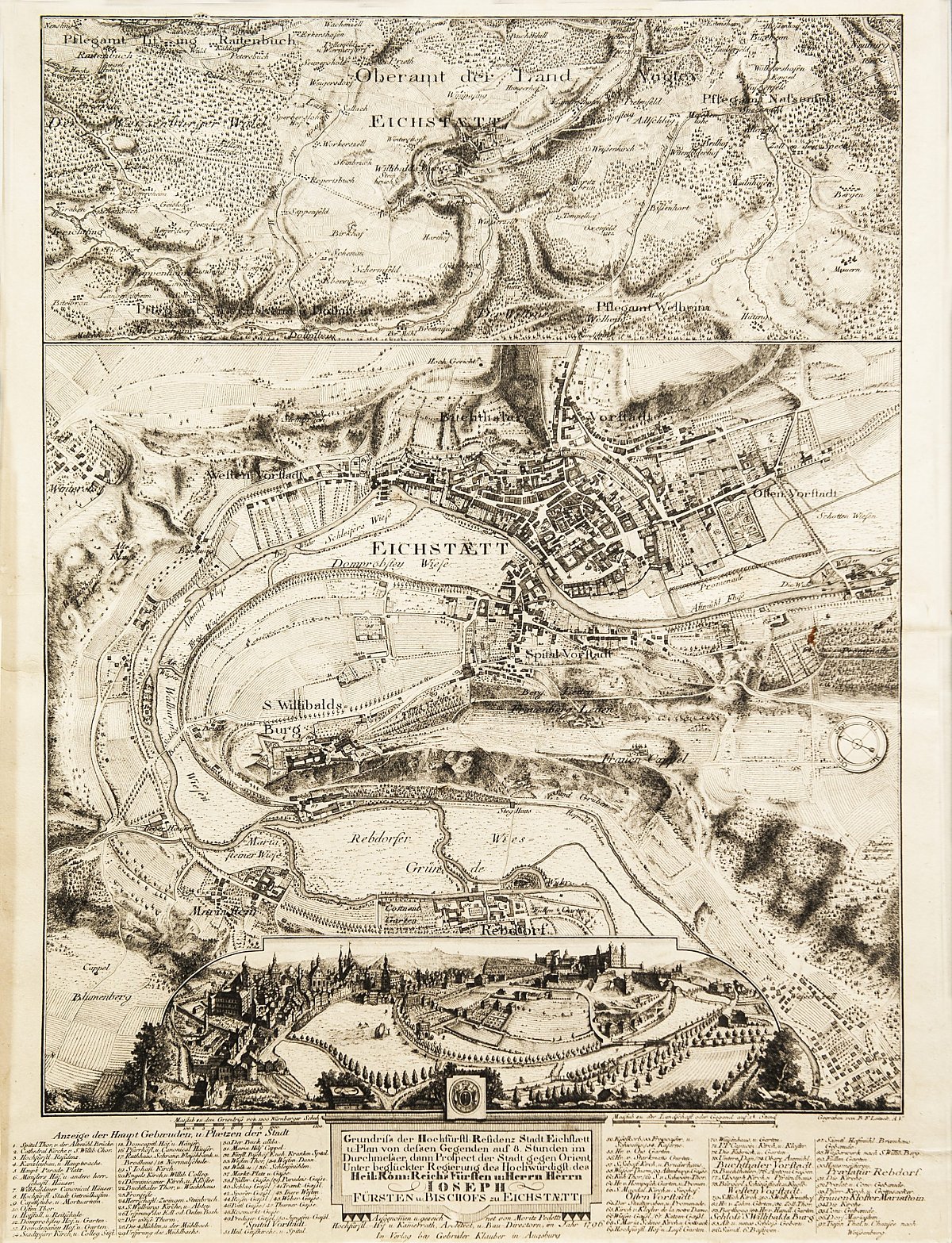 Stich nach Zeichnung des Eichstätter Hofbaumeisters Mauritio Pedetti 1796 Die Vorlage zu diesem Stich wurde vom Eichstätter Hofbaumeister Mauritio Pedetti 1796 gezeichnet. Beeindruckend werden hier eine Karte des Gebiets um Eichstätt, ein Grundrissplan der Residenzstadt und eine Stadtansicht und sowie ein Textteil und eine Legende kombiniert. |