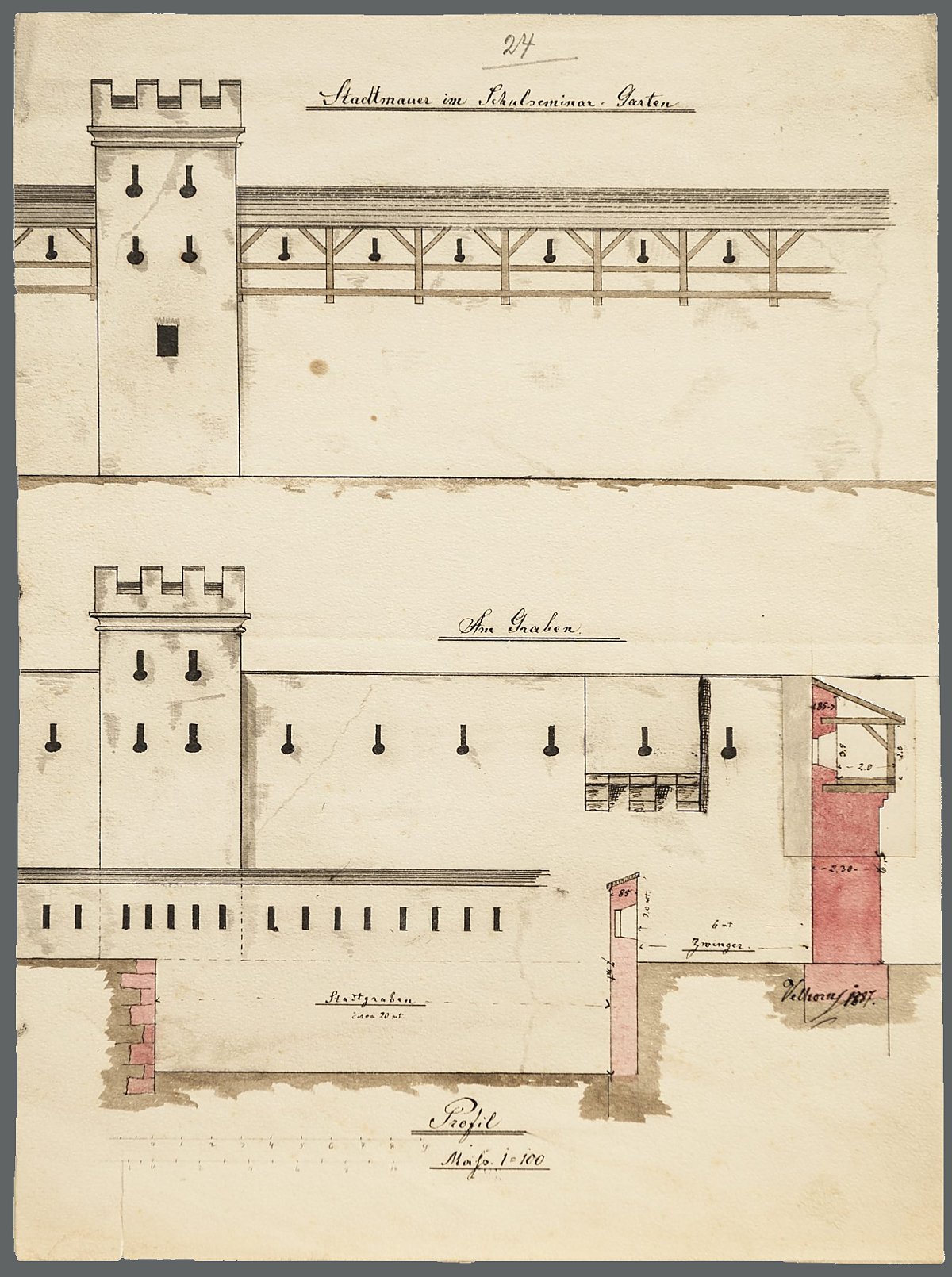 Pläne zur Veränderung der mittelalterlichen Stadtmauer 1887 Gezeichnete Pläne dokumentieren Veränderungen an der mittelalterlichen Stadtmauer, die aufgrund eines königlichen Erlasses größtenteils erhalten geblieben ist. 1887 projektierte Stadtbaumeister Velhorn Veränderungen an einem Teilbereich. |