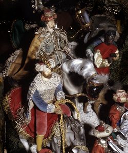 Familie, die Heiligen Drei Könige mit Gefolge, neben Schriftgelehrten