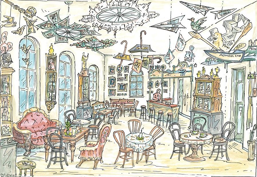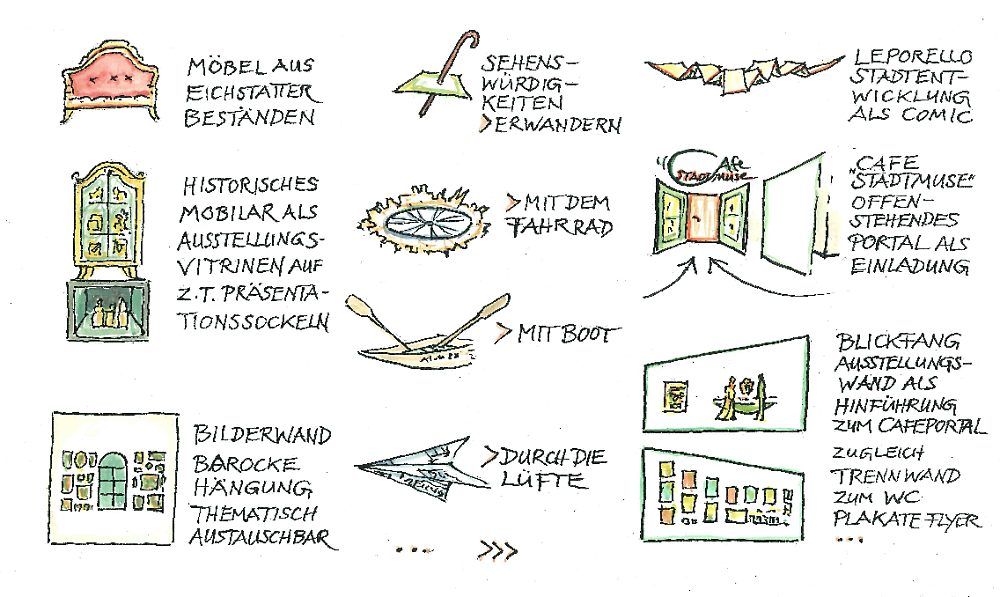 Diese Skizze aus der Feder von Stefan Weyergraf-Streit mit historischem Mobiliar aus Eichstätter Beständen entwirft eine alternative und praktikable Stadtmuseumsidee im Bahnhofsgebäude. Vitrinen bergen in diesem Café-Ambiente allerhand Kuriositäten und fungieren als Wunderkammer. Die Höhe des Raumes könnte mit Themen der Freizeitgestaltung im Naturpark Altmühltal wie Wandern, Radfahren, Wasser- und Luftsport bespielt werden. Der Besucher würde sich also in einem originalen, aus der Bürgermitte heraus entwickelten, stadttypischen Flair wiederfinden, das gleichzeitig eine anregende Wohlfühlatmosphäre vermittelt. Mit regelmäßig wechselnden Ausstellungen und Installationen, die der Verein oder andere interessierte Gruppen übernehmen könnten, ließe sich somit eine anregende Stadtmuseumsidee realisieren: niederschwellig und trotzdem anspruchsvoll und vor allem: als Gewinn für die Stadt.